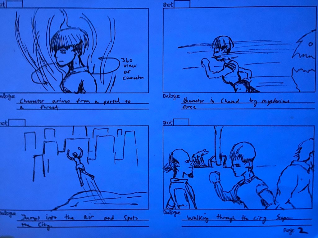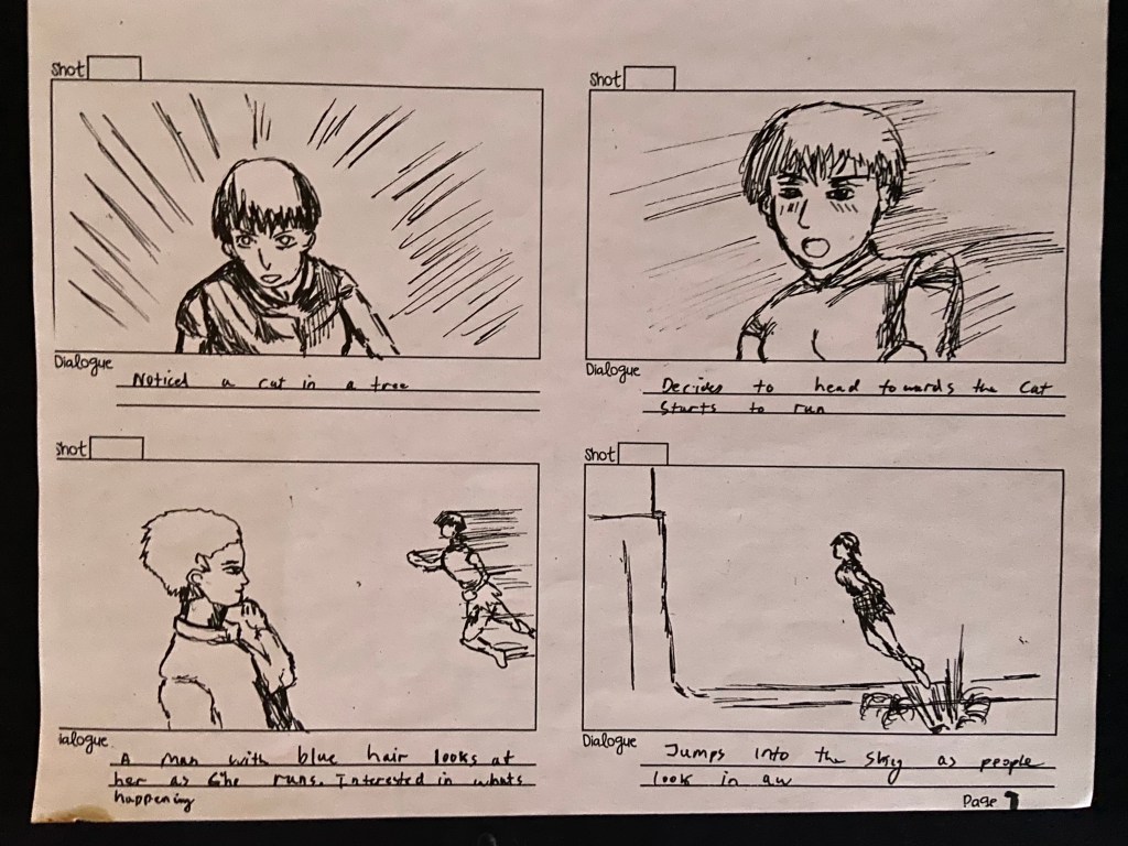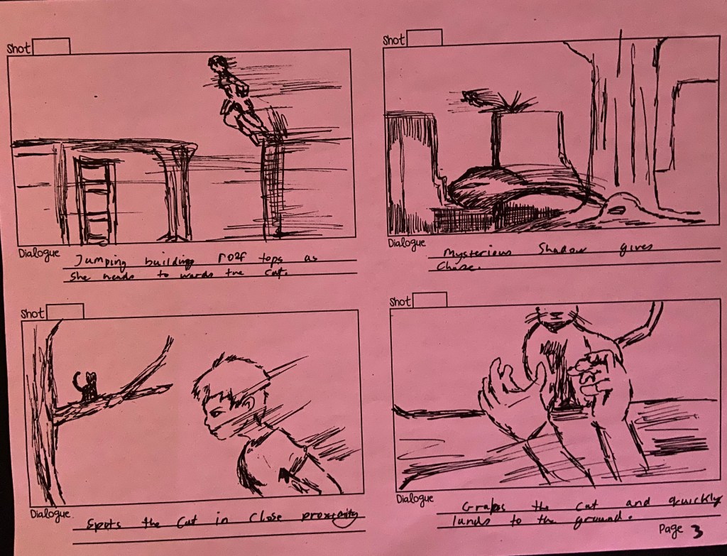 This story board sequence starts out with a character landing in a forest and begins running from a shadow like figure. The next stet of scenes will show the character jumping high into the sky to evade the shadow and escape completely untouched. The character will be running through a city on top of roofs and will notice a cat in a tree which she will swoop in and rescue it.